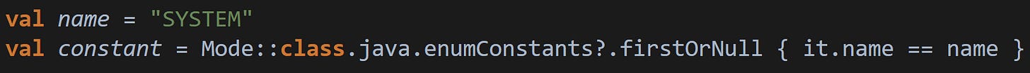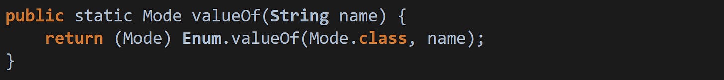 method in bytecode is a thin wrapper around the JVM’s built-in lookup. It uses Enum.valueOf()
