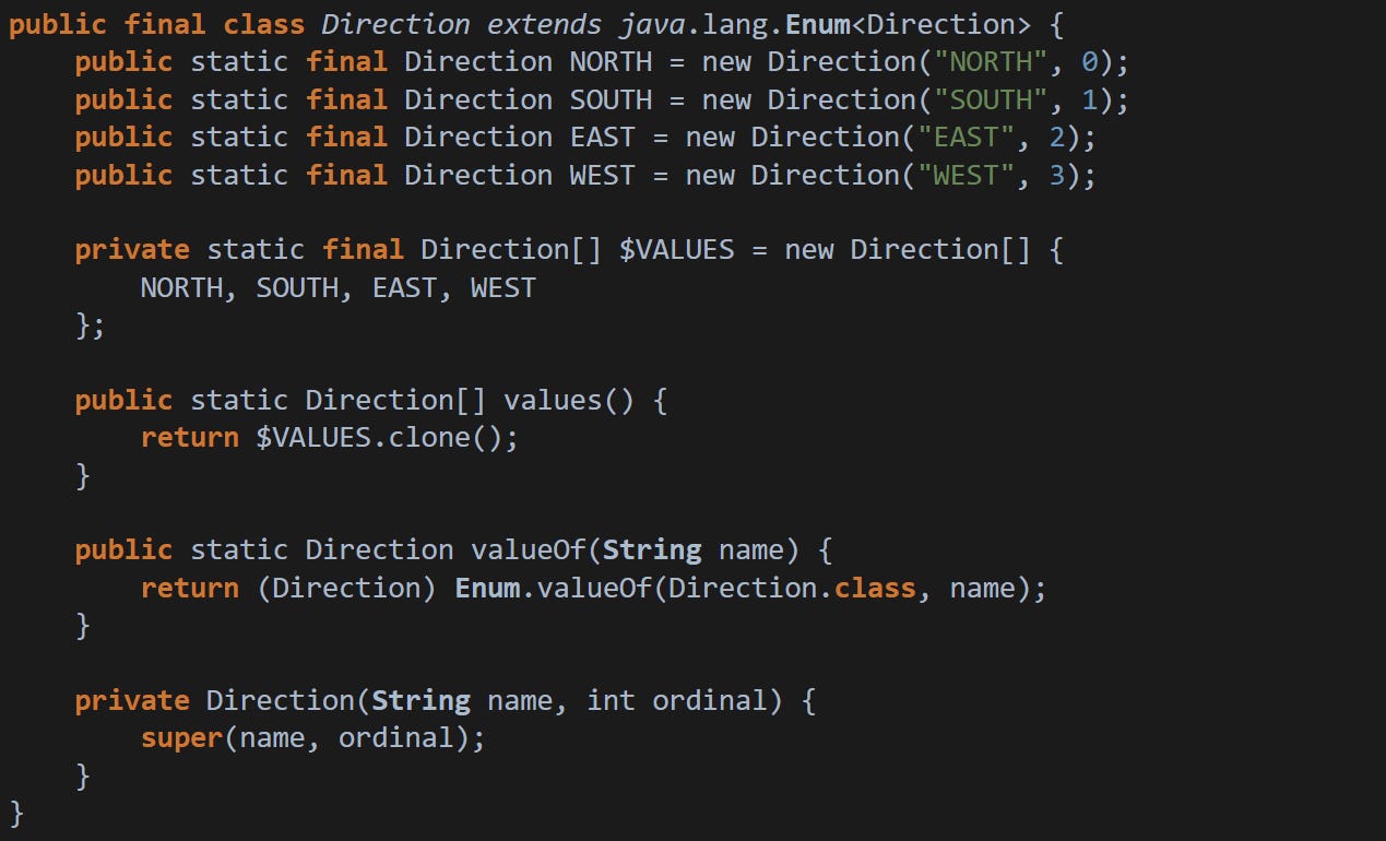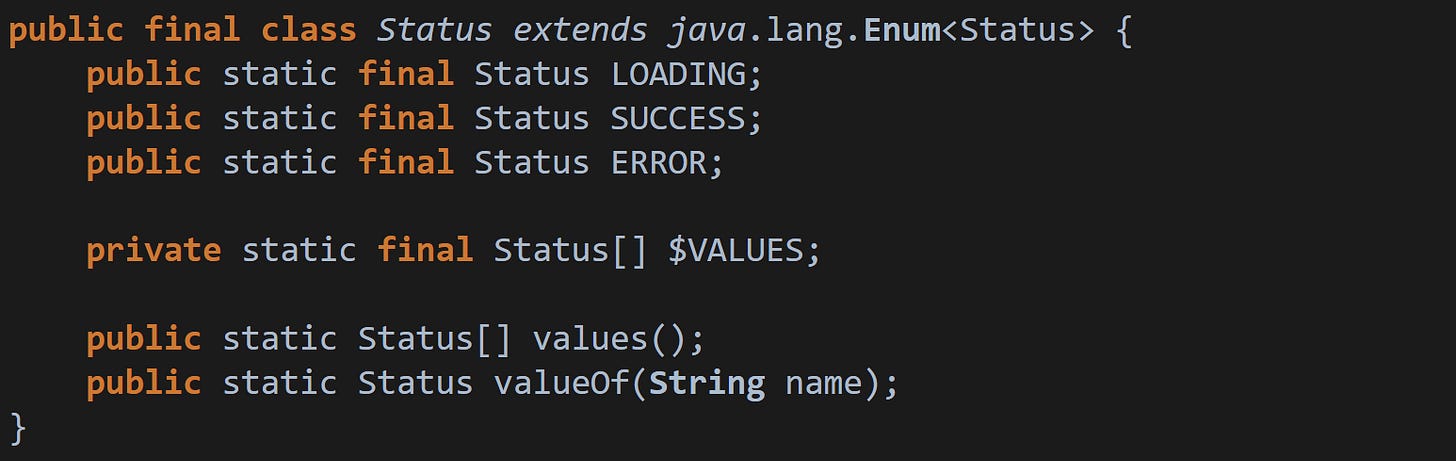 The compiler fills in the rest by generating fields, methods, and bytecode that follow the JVM enum model. Each enum maps directly to what the JVM expects, following the same structure used in Java. Kotlin enum classes end up producing final classes with static fields, synthetic helper methods, and a hidden array that backs most of the enum behaviors you get out of the box. All of this gets baked into the compiled bytecode. You’re not required to write any of it manually, but it’s there once the class is built.
