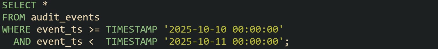 That block captures a full day of events with no overlap into the next day. Services that run audits nightly use this method to break work into steady slices.