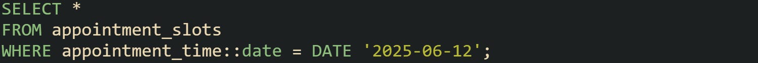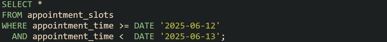 This pattern pulls the timestamp down to a date. It works well when the time is irrelevant or when the service books events by day rather than exact hour. Some scheduling tools store ranges but use a daily check to filter candidates quickly.