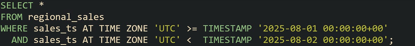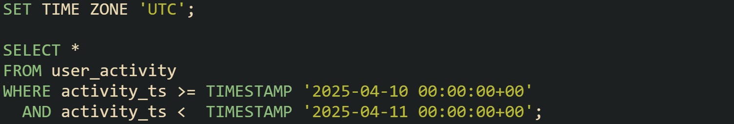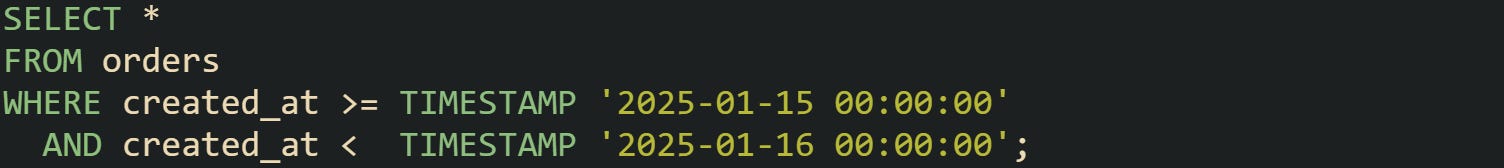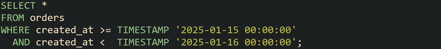 This window carries the same meaning as a cast but keeps the time values intact. Many use this during late nightly data pulls, where a full day boundary matters more than trimming the column.