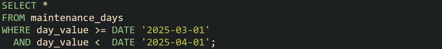 This pattern shapes a month slice without touching time fields. The window stays tight across the calendar and avoids missing the last day due to a time drift. Reports that track service windows, maintenance periods, or rule-based open days rely on this form of filter.