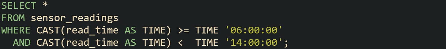Time of day slices matter when the hour has meaning. Traffic waves, sensor activity during daylight hours, or service windows that run during fixed shifts all fall into this category. Pulling only the time field out of a timestamp lets you match against a narrow span without losing the date. This keeps the query tight when the focus is purely on the clock.