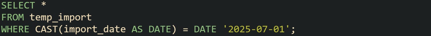 That cast removes the risk of comparing plain text to a date object. Quality checks use this pattern during batch processing where imports rely on fixed cutoffs for the day.