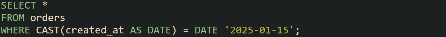 Casting a timestamp to a date trims the time and leaves the calendar portion. This works well when the time of day adds no value to the filter. Some developers work with tables where timestamps mark creation times, order placements, or user updates. Even when those rows land at different hours, a date slice is enough for daily views as long as the time field drops away.