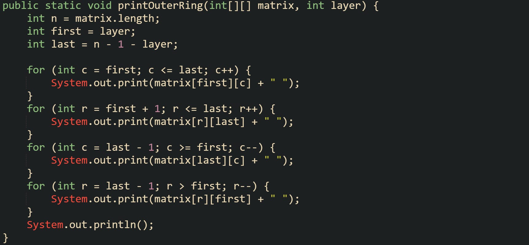 ![public static void printOuterRing(int[][] matrix, int layer) { int n = matrix.length; int first = layer; int last = n - 1 - layer; for (int c = first; c <= last; c++) { System.out.print(matrix[first][c] + " "); } for (int r = first + 1; r <= last; r++) { System.out.print(matrix[r][last] + " "); } for (int c = last - 1; c >= first; c--) { System.out.print(matrix[last][c] + " "); } for (int r = last - 1; r > first; r--) { System.out.print(matrix[r][first] + " "); } System.out.println(); } public static void printOuterRing(int[][] matrix, int layer) { int n = matrix.length; int first = layer; int last = n - 1 - layer; for (int c = first; c <= last; c++) { System.out.print(matrix[first][c] + " "); } for (int r = first + 1; r <= last; r++) { System.out.print(matrix[r][last] + " "); } for (int c = last - 1; c >= first; c--) { System.out.print(matrix[last][c] + " "); } for (int r = last - 1; r > first; r--) { System.out.print(matrix[r][first] + " "); } System.out.println(); }](https://substackcdn.com/image/fetch/$s_!BhTf!,w_2400,c_limit,f_auto,q_auto:good,fl_progressive:steep/https%3A%2F%2Fsubstack-post-media.s3.amazonaws.com%2Fpublic%2Fimages%2F89f82612-e748-452f-970c-867413789f7a_1723x798.png)