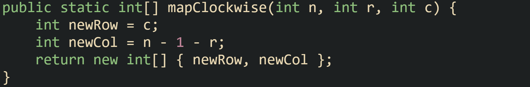 ![public static int[] mapClockwise(int n, int r, int c) { int newRow = c; int newCol = n - 1 - r; return new int[] { newRow, newCol }; } public static int[] mapClockwise(int n, int r, int c) { int newRow = c; int newCol = n - 1 - r; return new int[] { newRow, newCol }; }](https://substackcdn.com/image/fetch/$s_!Rvqs!,w_1456,c_limit,f_auto,q_auto:good,fl_progressive:steep/https%3A%2F%2Fsubstack-post-media.s3.amazonaws.com%2Fpublic%2Fimages%2F9e4e9c3f-3b35-4a7a-848e-b45804c1424e_1690x280.png)
