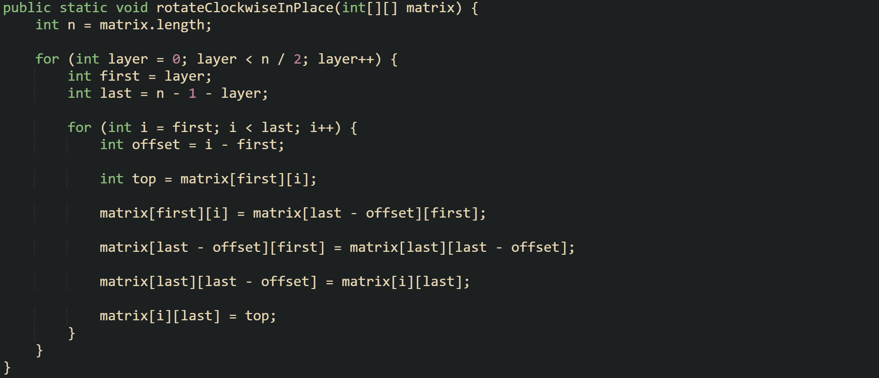 ![public static void rotateClockwiseInPlace(int[][] matrix) { int n = matrix.length; for (int layer = 0; layer < n / 2; layer++) { int first = layer; int last = n - 1 - layer; for (int i = first; i < last; i++) { int offset = i - first; int top = matrix[first][i]; matrix[first][i] = matrix[last - offset][first]; matrix[last - offset][first] = matrix[last][last - offset]; matrix[last][last - offset] = matrix[i][last]; matrix[i][last] = top; } } } public static void rotateClockwiseInPlace(int[][] matrix) { int n = matrix.length; for (int layer = 0; layer < n / 2; layer++) { int first = layer; int last = n - 1 - layer; for (int i = first; i < last; i++) { int offset = i - first; int top = matrix[first][i]; matrix[first][i] = matrix[last - offset][first]; matrix[last - offset][first] = matrix[last][last - offset]; matrix[last][last - offset] = matrix[i][last]; matrix[i][last] = top; } } }](https://substackcdn.com/image/fetch/$s_!bglI!,w_2400,c_limit,f_auto,q_auto:good,fl_progressive:steep/https%3A%2F%2Fsubstack-post-media.s3.amazonaws.com%2Fpublic%2Fimages%2F29ea3494-4e62-43d8-b1f8-80f0133f20c3_1797x773.png)