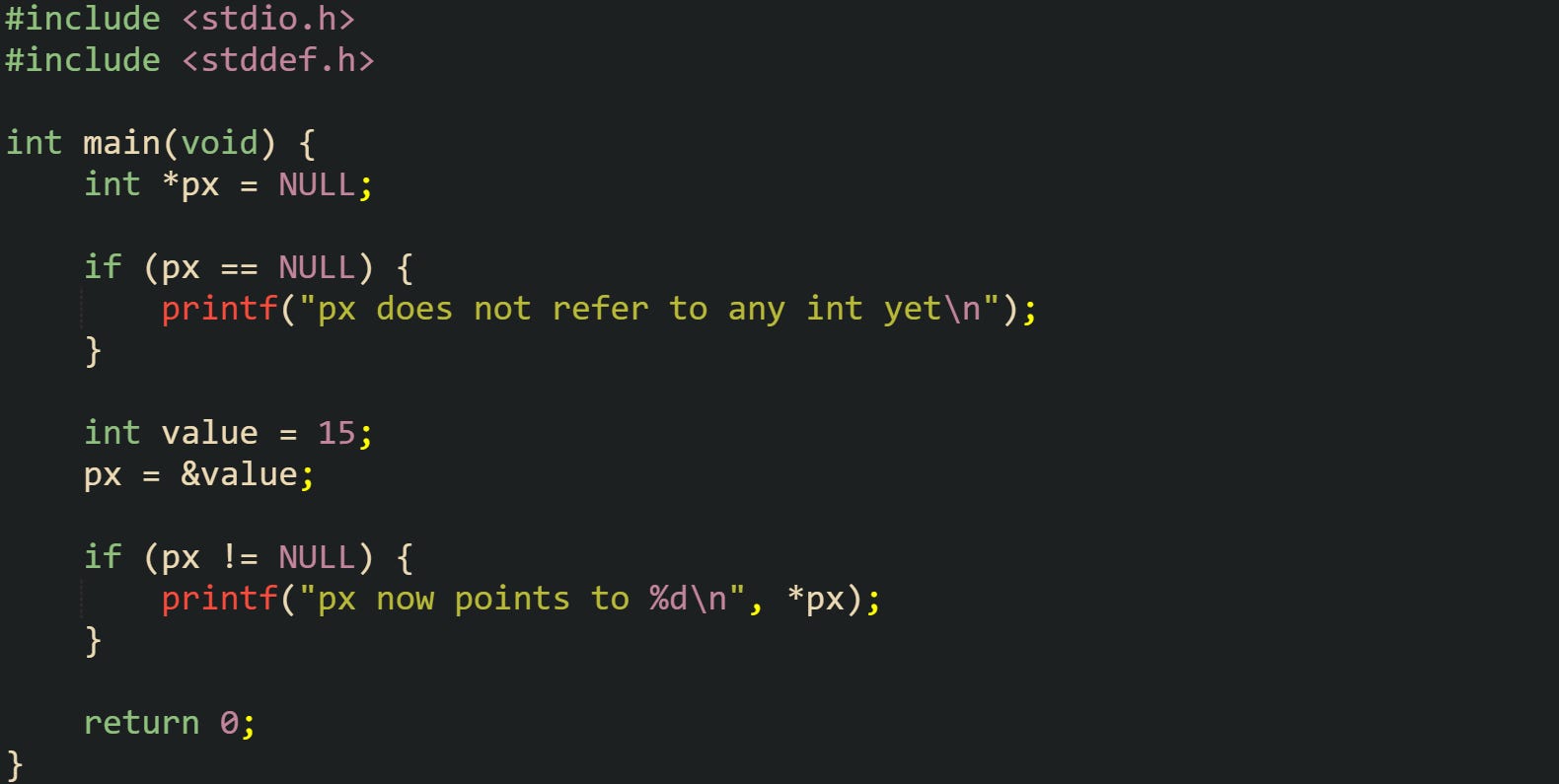 The language allows null pointer values that compare unequal to any valid object address. A null pointer is a special bit pattern that does not point to live storage. The macro NULL from headers such as <stddef.h> or <stdio.h> expands to a null pointer constant. In C23, the identifier nullptr is also defined as a null pointer constant of type nullptr_t. Code can test pointers against these values to see whether they hold a useful address.