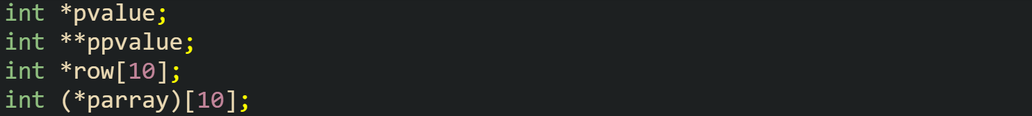 The identifier pvalue sits next to a single *, so pvalue is a pointer to int. The identifier ppvalue sits next to two stars, so it is a pointer to a pointer to int. The identifier row sits next to [10], which binds more tightly than *, so row is an array of ten elements where each element has type int *. The identifier parray sits inside parentheses with *, and that group sits next to [10], so parray is a pointer to an array of ten int values.