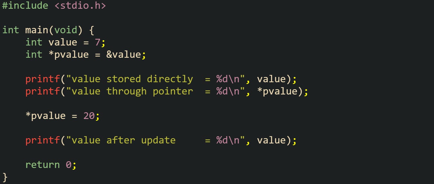 The expression &value forms an int * that holds the address of value. That address is stored in pvalue. The dereference *pvalue accesses the int at that address. When *pvalue appears on the left side of an assignment, the assignment writes through the pointer to the original value variable.