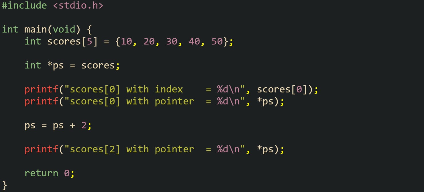 ![#include <stdio.h> int main(void) { int scores[5] = {10, 20, 30, 40, 50}; int *ps = scores; printf("scores[0] with index = %d\n", scores[0]); printf("scores[0] with pointer = %d\n", *ps); ps = ps + 2; printf("scores[2] with pointer = %d\n", *ps); return 0; } #include <stdio.h> int main(void) { int scores[5] = {10, 20, 30, 40, 50}; int *ps = scores; printf("scores[0] with index = %d\n", scores[0]); printf("scores[0] with pointer = %d\n", *ps); ps = ps + 2; printf("scores[2] with pointer = %d\n", *ps); return 0; }](https://substackcdn.com/image/fetch/$s_!n0sj!,w_1456,c_limit,f_auto,q_auto:good,fl_progressive:steep/https%3A%2F%2Fsubstack-post-media.s3.amazonaws.com%2Fpublic%2Fimages%2F3e05bb5d-fbc3-4877-adad-ad685917609e_1481x673.png)