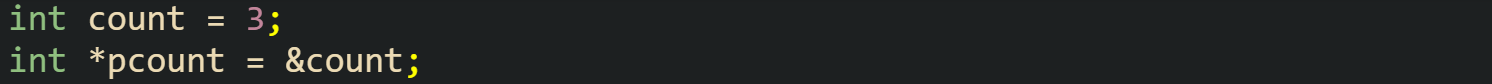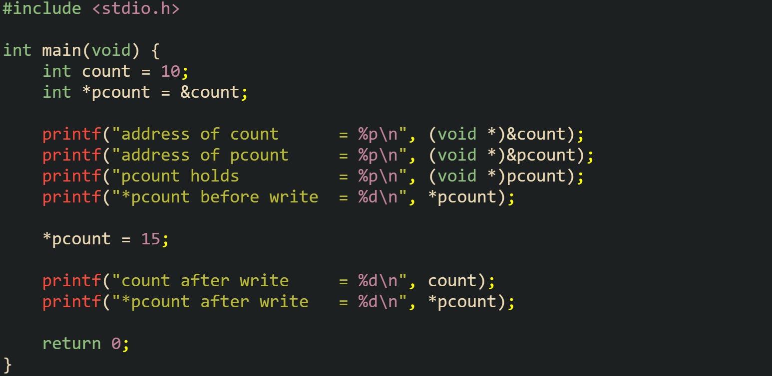 Two different regions of memory appear in that run. One region stores count, which begins at the address printed for &count. Another region stores pcount, which begins at the address printed for &pcount. The pointer variable pcount holds a number that matches &count, so dereferencing it reads and writes the same storage that belongs to count.