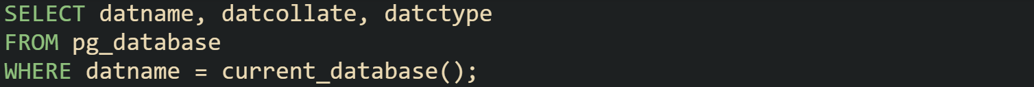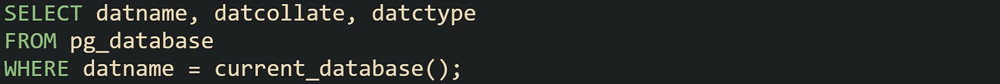 Let’s look at PostgreSQL example to see collation on the current database: