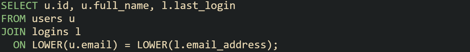 Email values from users and logins end up in the same case before the join condition runs, so mismatched casing between systems does not block the join.