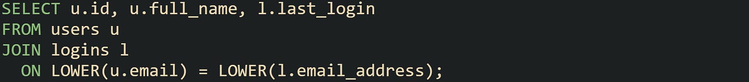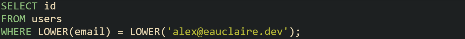 PostgreSQL relies heavily on function based comparison when integrating data from multiple sources. Email addresses stored by one system might use uppercase domains, while another system stores lower case values. A login query that normalizes both sides avoids surprises.