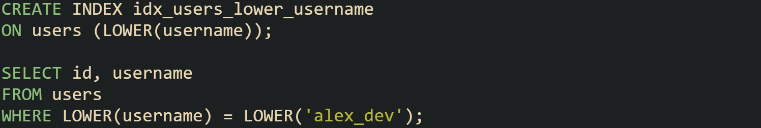 Query text and index expression now match, so PostgreSQL can plan an index scan on idx_users_lower_username rather than visiting every row. This structure works well for login names, email addresses, and similar identifiers that appear frequently in filters.