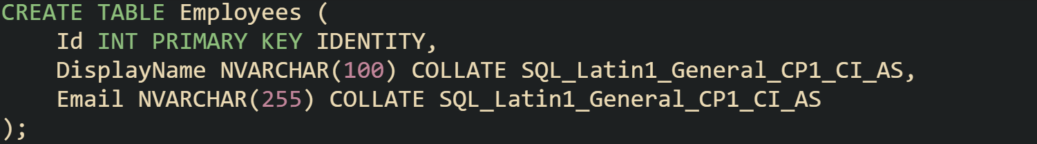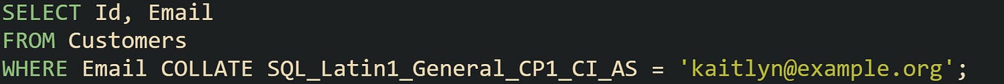 That COLLATE clause overrides any case sensitive database default, so Email values with different letter casing still line up for equality checks. Indexes on Email created with the same CI collation remain useful, because stored values and query comparison rules still agree.