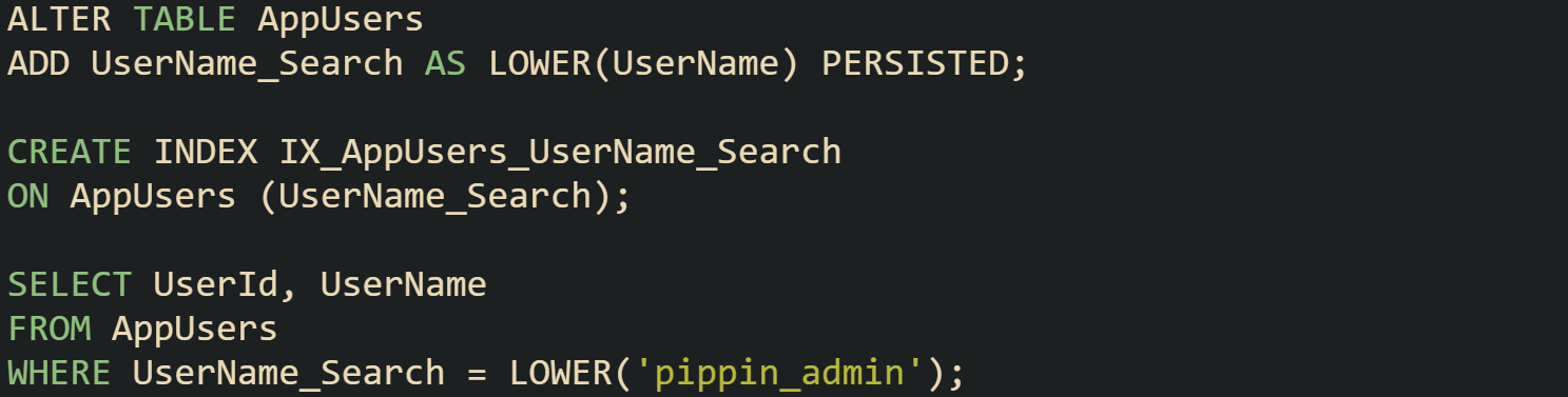 SQL Server leans on computed columns when the same function based comparison appears across many queries. A persisted computed column based on LOWER or UPPER lets the engine store the normalized value on disk and index it like any regular column.