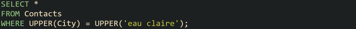 This SQL Server query searches contacts by city with UPPER: