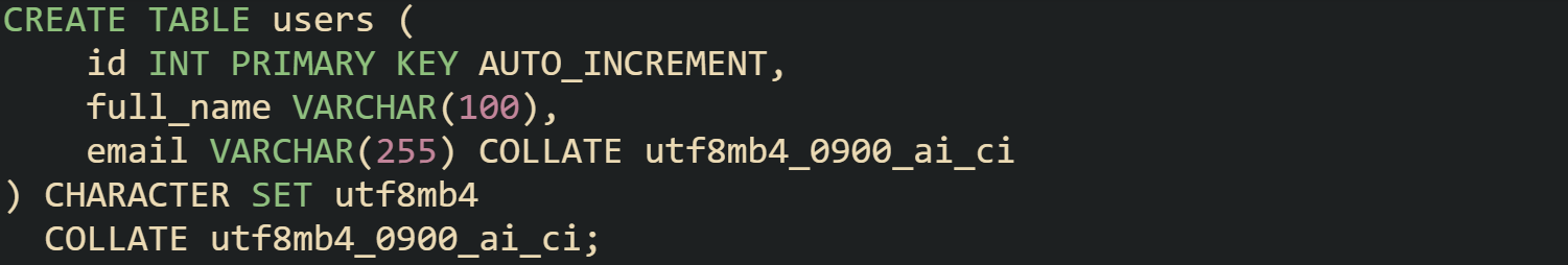 MySQL tables that use utf8mb4_0900_ai_ci for user facing text gain case insensitive equality and prefix search behavior naturally through standard B tree indexes. Queries such as WHERE email = ‘alex@example.com’ or WHERE email LIKE ‘alex%’ on columns with that collation can use regular indexes without extra expressions. Functions on the column side of the predicate such as LOWER(email) remove that advantage unless paired with an expression index.