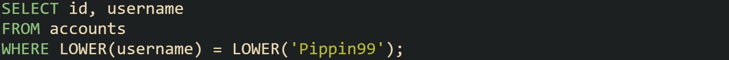 Usernames such as pippin99, PIPPIN99, or PipPin99 all match, because both the column value and the literal pass through LOWER before comparison. A functional index on LOWER(username) in MySQL 8 ties directly into this predicate and keeps response times stable as the accounts table grows.