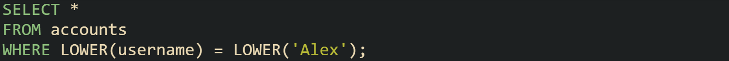 This query matches Alex, alex, or ALEX in the username column even if that column sits on a case sensitive collation. Both sides of the comparison move to lower case, so the result does not depend on how values were typed or stored.