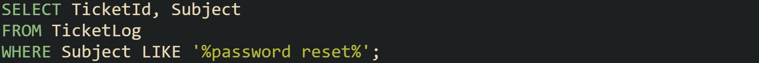 This SQL Server search scans ticket subjects for a phrase: