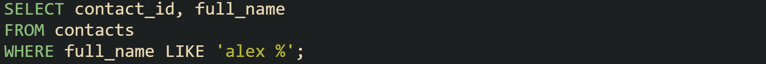 This MySQL query searches contact names with a trailing wildcard: