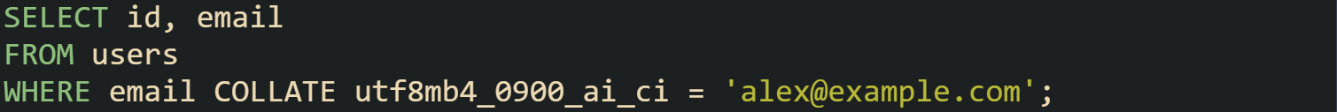 User input such as ALEX@example.com or Alex@example.com still matches, because the comparison for email runs under utf8mb4_0900_ai_ci rules. An index on email that uses the same collation can still support this predicate, so searches do not fall back to table scans purely because of case handling.
