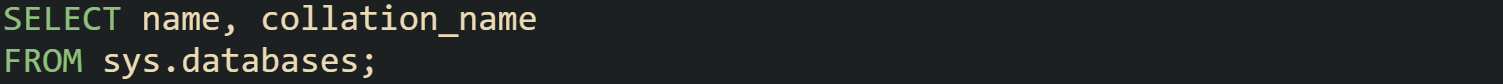 This query helps confirm which collation drives comparisons at the server and database level before any column level overrides.