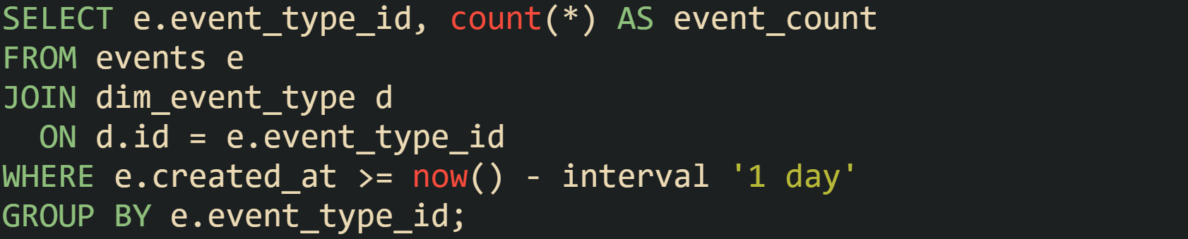 PostgreSQL often chooses a Hash Join here, building a hash table from dim_event_type and scanning a filtered subset of events. If statistics underestimate the number of recent events, the plan still shows a hash join, but at runtime the hash table grows larger than the optimizer expected, which can be inferred from EXPLAIN ANALYZE output when actual row counts at scan nodes and the hash join node exceed estimates by a large factor. Refreshing statistics on events gives the planner a better view of daily data volume, and in some setups, creating partial indexes on recent time ranges guides the optimizer toward plans that treat recent partitions differently from older data.