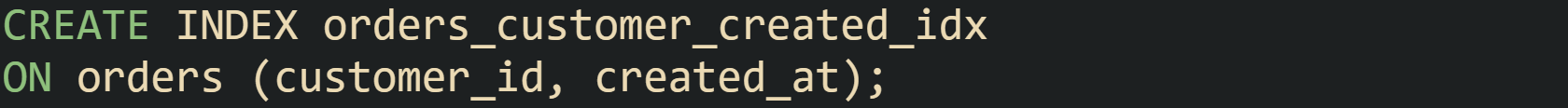Running the same query with that index in place often produces a plan in PostgreSQL that includes Index Scan using orders_customer_created_idx on orders with an Index Cond mentioning both customer_id and created_at. MySQL EXPLAIN output can shift to type = 'range' and show orders_customer_created_idx in the key column, with a much lower rows estimate. Index statistics feed those decisions, so plans change as data distributions and index definitions change.