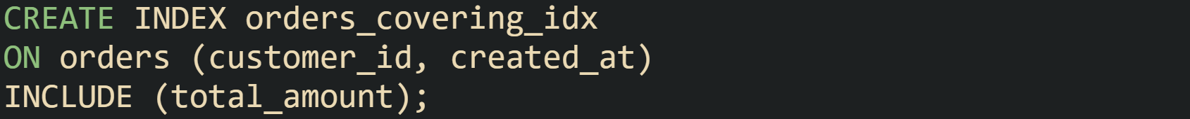 A query that selects customer_id, created_at, and total_amount while filtering by customer_id and a created_at range can use that index alone in SQL Server, and PostgreSQL can use Index Only Scan when its visibility map has been populated by recent vacuum activity. These plans reduce heap access, which is visible in operator cost and in lower I/O at runtime.