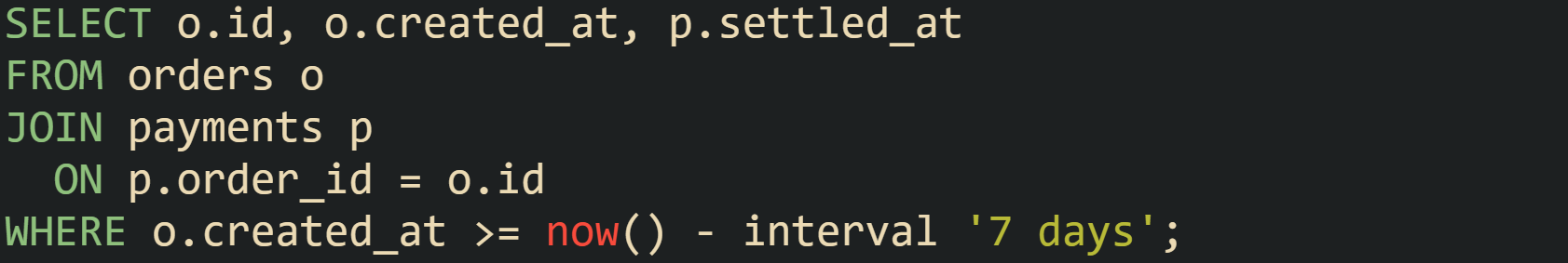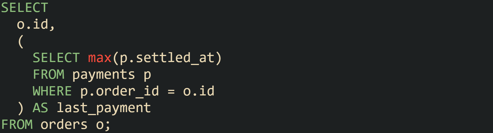 Creating a composite index on payments(order_id, settled_at) improves those inner lookups.