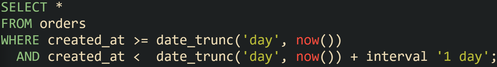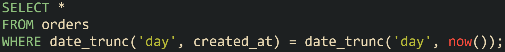 When there is an index on created_at, PostgreSQL still tends to report a Seq Scan on orders with a Filter: (date_trunc('day', created_at) = date_trunc('day', now())), because the function on the column does not match the index definition. Engines that support functional indexes can change that.