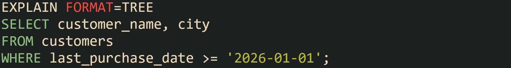 In FORMAT=TREE MySQL exposes extra details such as hash join usage and a more structured view of how the query will be handled than the classic tabular EXPLAIN result.