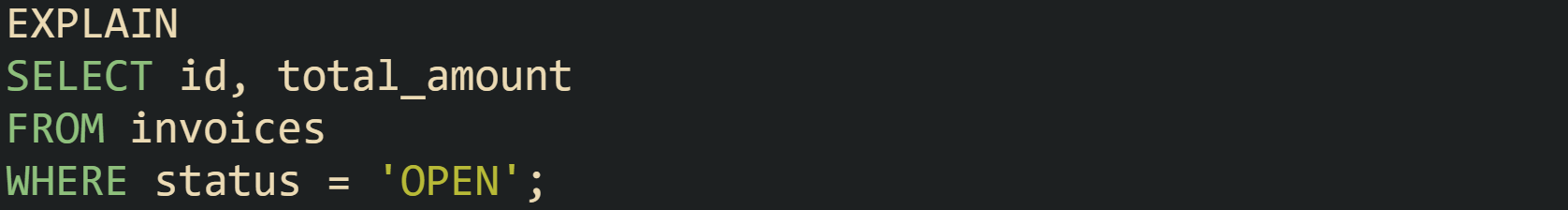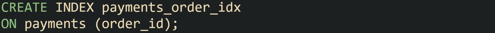 Running EXPLAIN again on the same query in PostgreSQL can now yield a Nested Loop where the outer input remains a selective scan on orders but the inner input becomes Index Scan using payments_order_idx on payments. SQL Server would typically switch to an Index Seek on payments in the join, and MySQL could move its type column for payments from ALL to ref. Row estimates for the inner step drop sharply, and nested loops become suitable again, because each outer row now drives a cheap index lookup instead of a full scan.