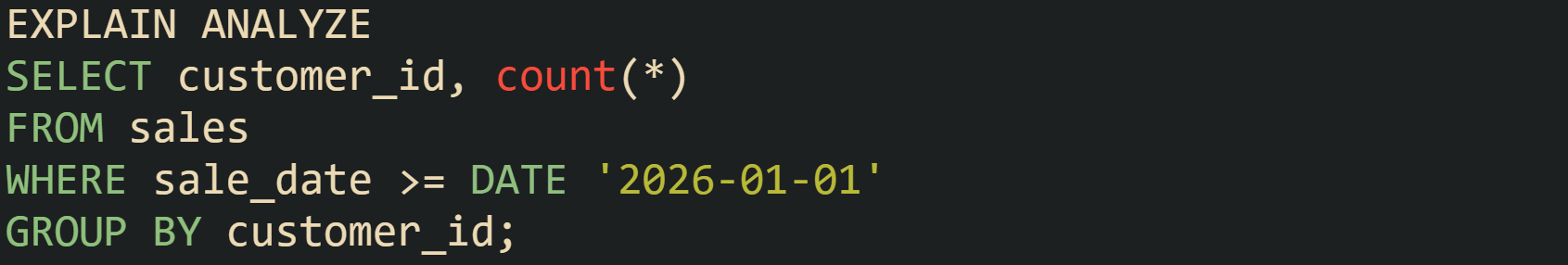 The plan for that query includes a scan on sales, possibly an index scan if an index on sale_date exists, a filter on the date condition, and an aggregate node that groups by customer_id. Row counts show how many sales pass the date filter, cost values reveal which operator dominates the work, and predicate fields indicate whether the date condition drives an index lookup or acts as a filter after rows are loaded. Looking at those attributes on each node turns a block of EXPLAIN text into a traceable description of how the database will process the query.