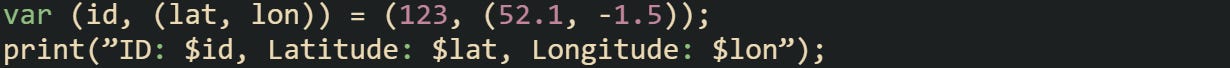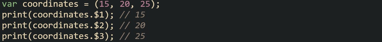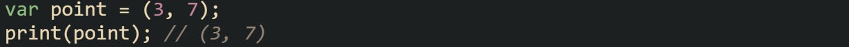 This record has three integers, so its type is (int, int, int). The order matters. A record (int, int) is a completely different type from (int, int, int) because the compiler encodes both the number of fields and their order into the type information.
