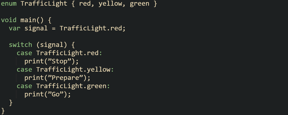 The compiler here enforces that all possible values of TrafficLight are handled. Leaving one out would result in a compile-time error, which is how exhaustiveness checking protects against missing cases.