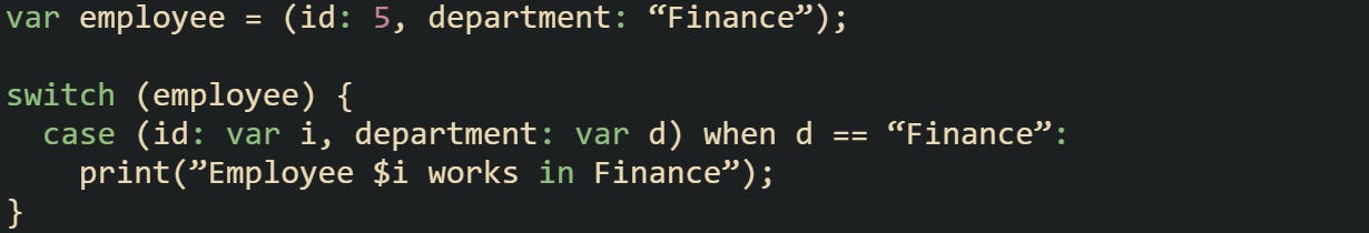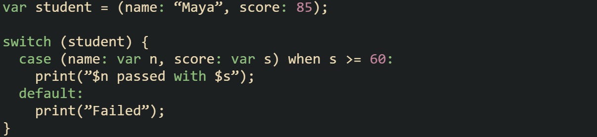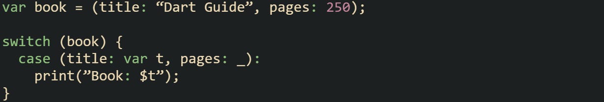 Pattern matching in Dart isn’t a layer of syntax that rewrites into other constructs. It’s tightly woven into the compiler. Each pattern is checked at compile time against the type of the value it matches. For records, the compiler verifies both the number of fields and their types. For named fields, the compiler confirms that the names exist and match exactly.