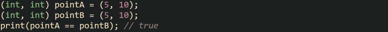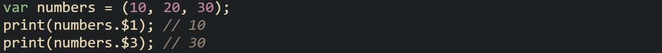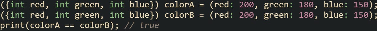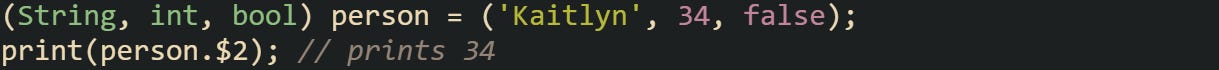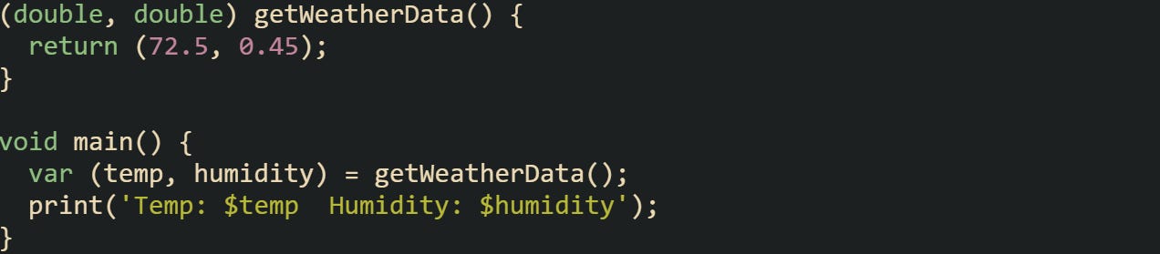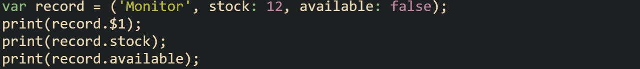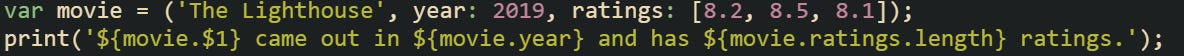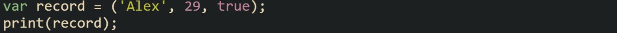 ![var movie = ('The Lighthouse', year: 2019, ratings: [8.2, 8.5, 8.1]); print('${movie.$1} came out in ${movie.year} and has ${movie.ratings.length} ratings.'); var movie = ('The Lighthouse', year: 2019, ratings: [8.2, 8.5, 8.1]); print('${movie.$1} came out in ${movie.year} and has ${movie.ratings.length} ratings.');](https://substackcdn.com/image/fetch/$s_!wRGu!,w_2400,c_limit,f_auto,q_auto:good,fl_progressive:steep/https%3A%2F%2Fsubstack-post-media.s3.amazonaws.com%2Fpublic%2Fimages%2Ffef7defa-15ef-400e-b632-8d1e1b79b1af_1184x56.png)