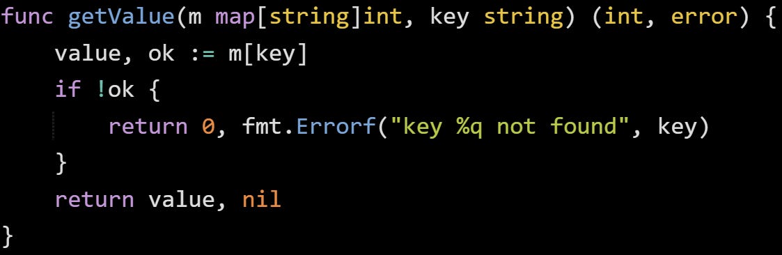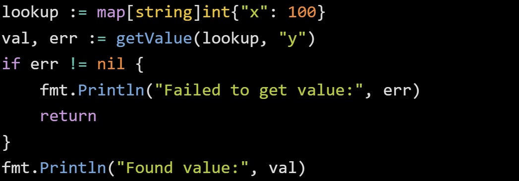 You’ll often see functions that return a result and an error side by side. The error always comes last, which makes it easy to scan and understand quickly. Here’s a basic example that fetches a number from a map: