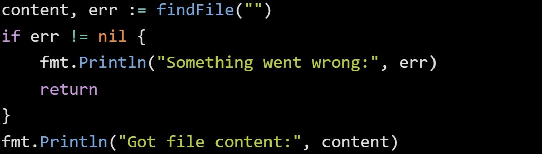 The whole pattern depends on Go’s ability to return more than one value from a function. Without that, error handling like this would be much harder to manage. This is one of the features that sets Go apart from many older compiled languages.