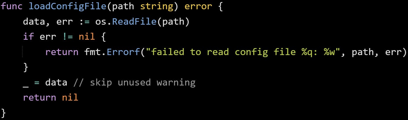 This function reads a file, returns an error if it fails, and stops right there. No further work happens after the error check, so there’s no chance of acting on bad data or assuming the read succeeded.