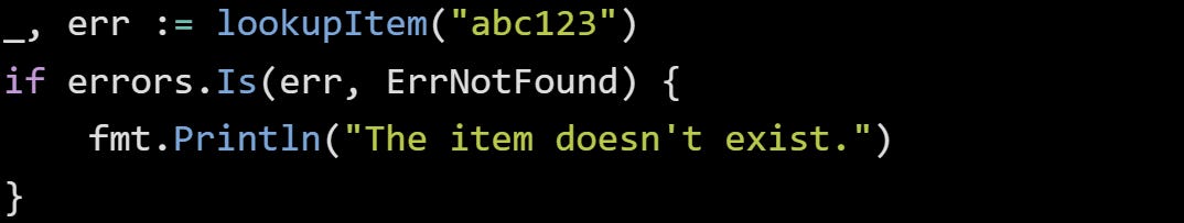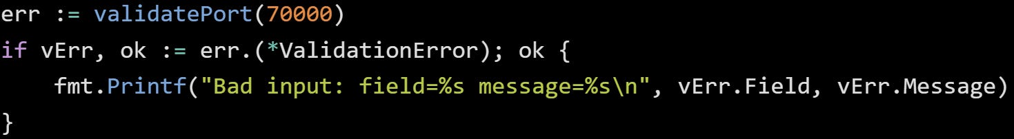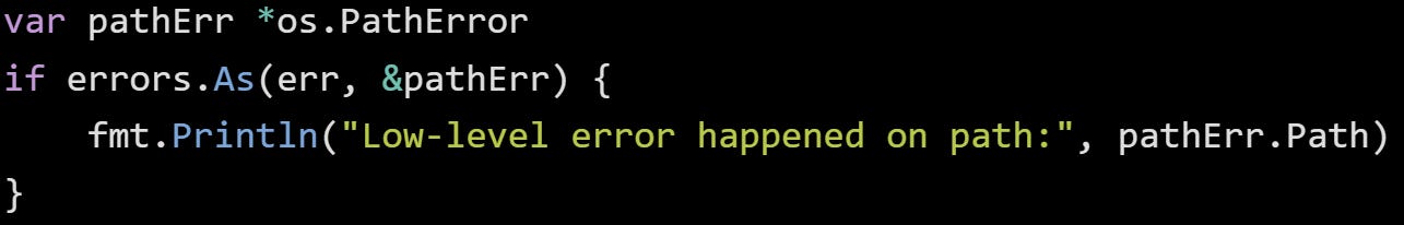 Instead of doing a bunch of string matching or building a custom error map, you just use Go’s type system. The error is still just a value, but now it carries structure with it. This also works well when you want to group related errors. You might have a NetworkError type with fields for the host and port, or a RetryableError that lets you retry based on type instead of message.