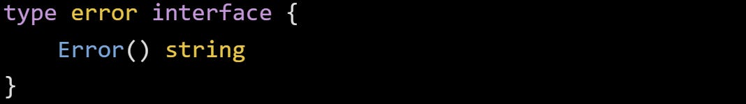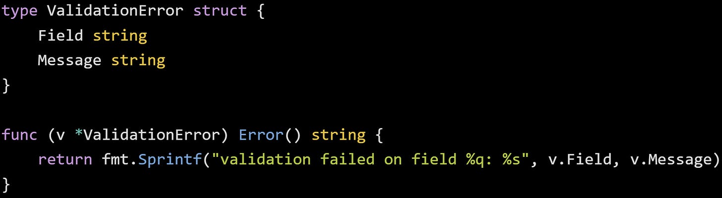 Any type with an Error() string method qualifies as an error. That means you can attach fields to your error and return more than just a sentence. It’s not about making things fancy, it’s about giving your code a way to carry information that’s actually useful when you’re trying to figure out what went wrong.