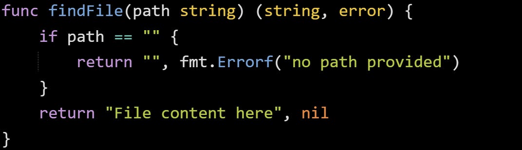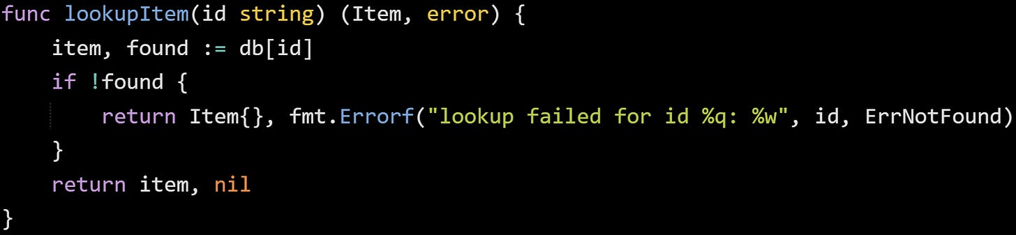 This also makes chaining errors across functions easier to follow. If you pass the error along from one function to another, it stays attached to the function where it started. You don’t have to decorate it with metadata or catch it with a special handler. You just return it, and if needed, wrap it with more context.