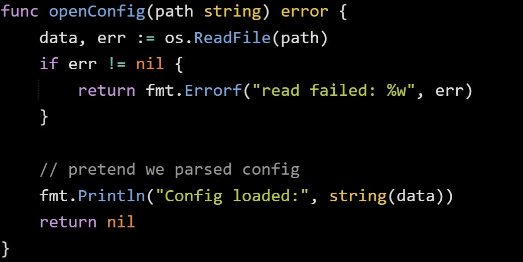 The fmt.Errorf call wraps the original os.PathError so you don’t lose what happened. You get to add your own message while still keeping the base error alive.